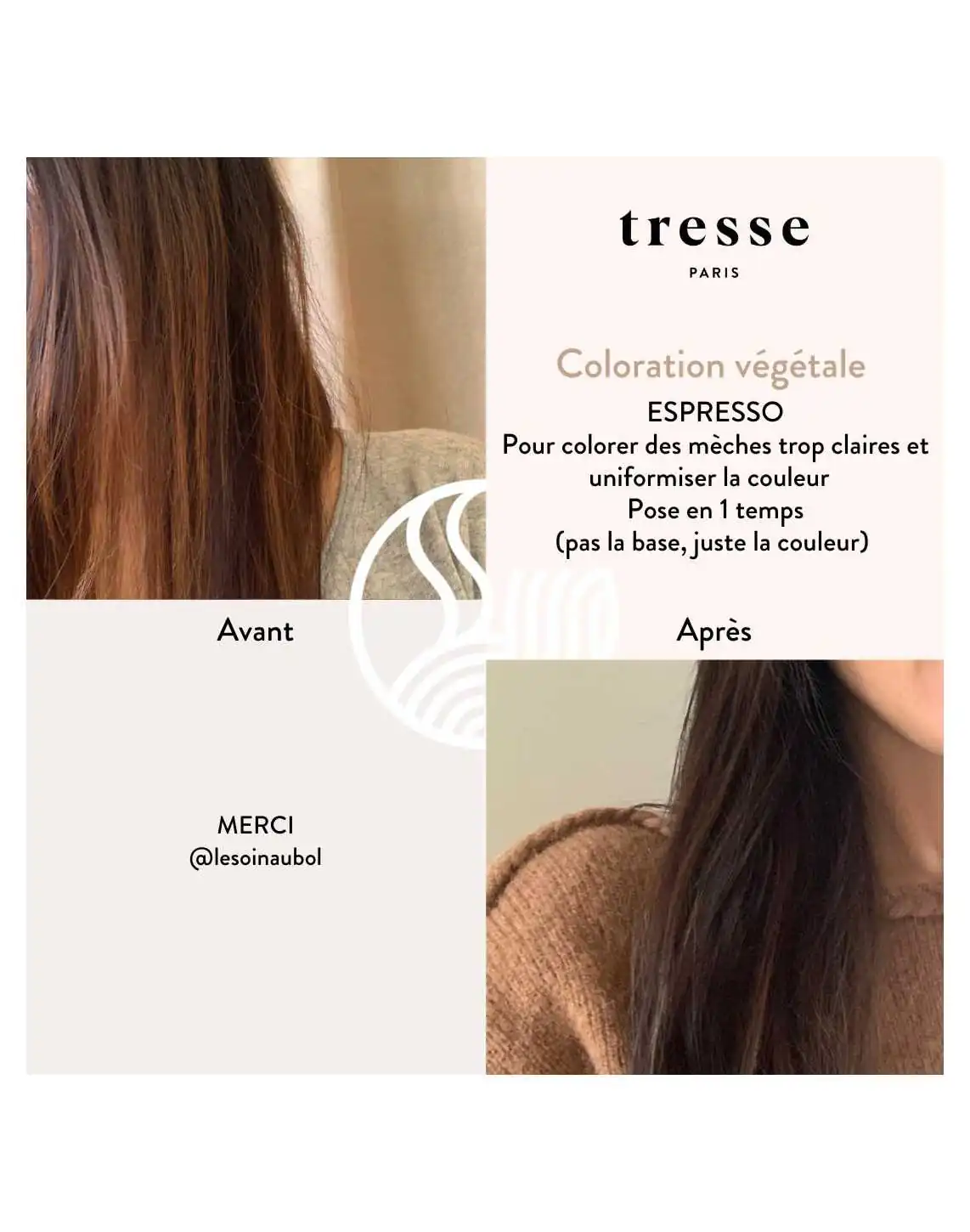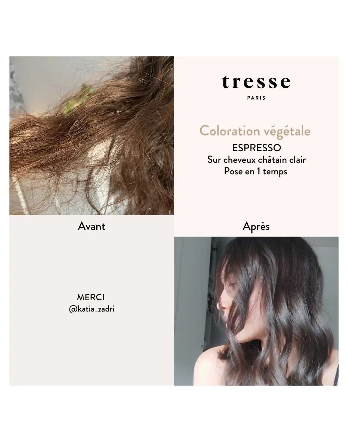 Tone-on-tone, Tresse plant-based hair color blends seamlessly with your natural shade. As it contains no chemicals, it will not lighten your hair. Recommended for brown to dark brown hair.