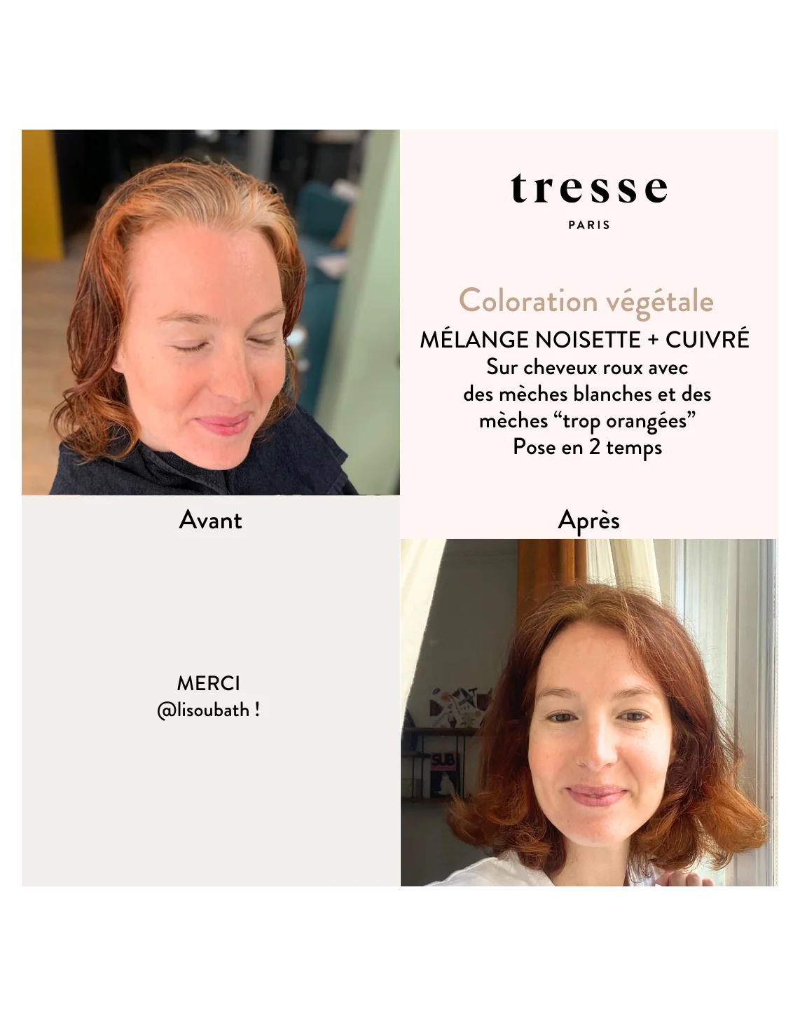 Tone-on-tone, Tresse plant-based hair color blends seamlessly with your natural shade. As it contains no chemicals, it will not lighten your hair. Recommended for light blonde to chestnut hair.