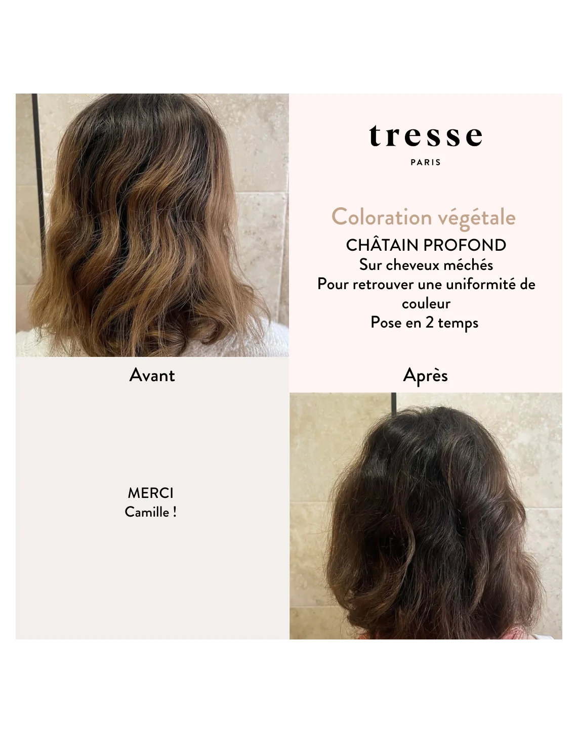 Tone-on-tone, Tresse plant-based hair color blends seamlessly with your natural shade. As it contains no chemicals, it will not lighten your hair. Recommended for chestnut to brown hair.